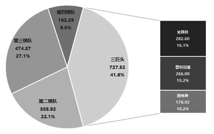 全球輪胎企業按照銷售份額可以分為四大梯隊。第一梯隊,即三巨頭米其林、普利司通與固特異,2022年銷售額分別為282.6億美元、266.0億美元及178.9億美元,三巨頭合計銷售份額占比41.6%。第二梯隊,年銷售額大于50億美元的公司,包括德國大陸集團、日本住友橡膠、意大利倍耐力、韓國韓泰輪胎等知名企業,第二梯隊合計銷售份額占比22.1%。第三梯隊,年銷售額處于10億美元至50億美元之間的公司,國內龍頭上市企業基本上位于該梯隊,第三梯隊合計銷售份額占比27.1%。除去第一梯隊之外,輪胎企業之間的競爭激烈且殘酷,三巨頭品牌力及銷量處于領先地位。